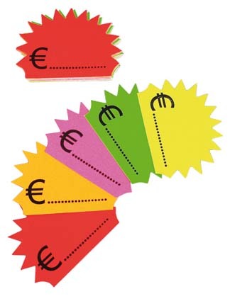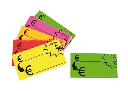 Cartoncino colorato stampa sconto adatto alla scrittura con pennarelli. Confezione n° 50 pezzi vari colori.